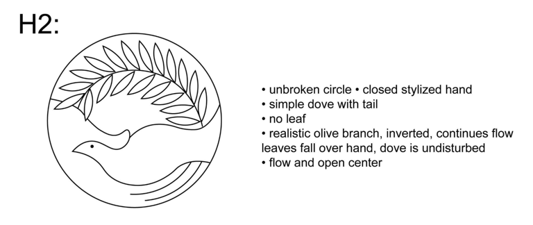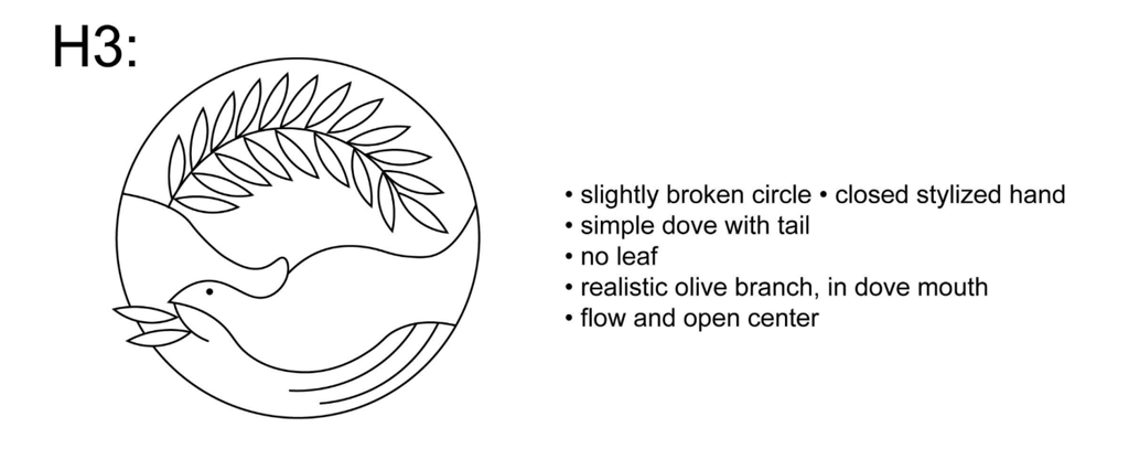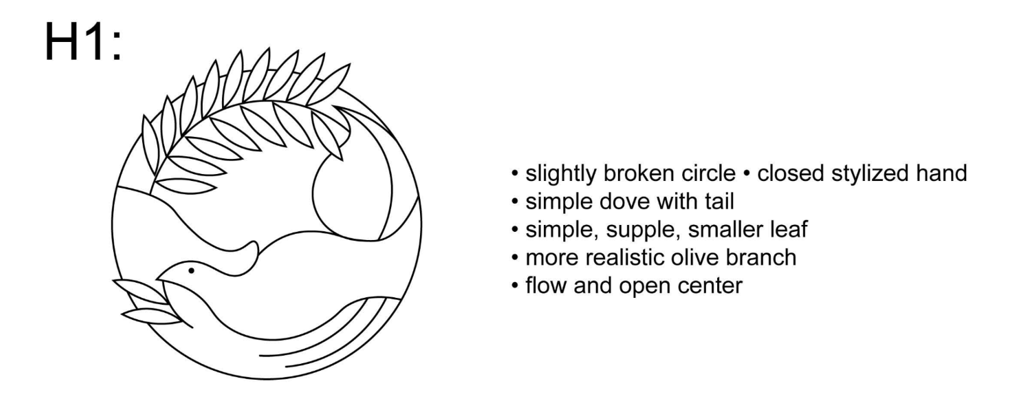 The H series emphasizes the olive branch as a central element. The stylized hand remains, and the dove is simplified. The olive branch variations in this series explore different directional flows, as well as experiments with the breaking of the circle. There are explorations of the olive branch being clasped in the dove's mouth. The logos on the right hand side reflect virtually the same designs, with the exception of the dove gaining a wing.