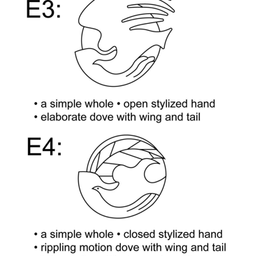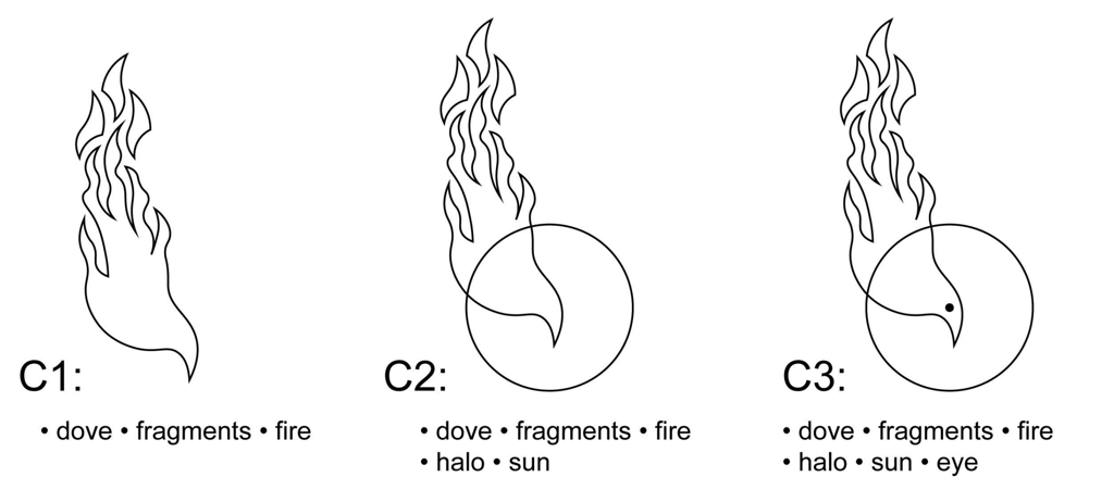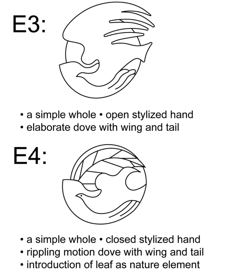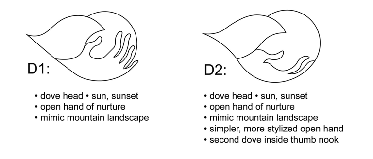 Next, the hand entered the design as the primary figure in the exploration, while the dove moved to the background of focus as an abstraction. The visual note that would become the key feature in the final design first arrives in D2, in which there is a smaller dove that emerges from the negative space generated by the crook of the thumb in the hand.